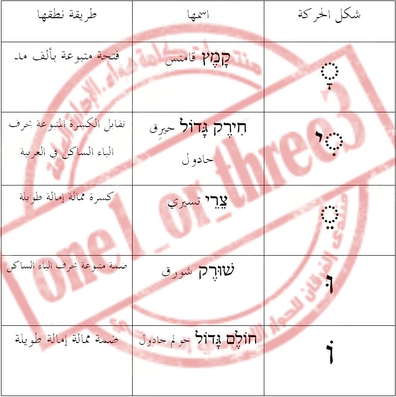وتحت ظل اللغة العربية والحضارة الإسلامية في القرن السابع استخدم الماسوريون بعض العلامات والنقاط للدلالة على هذه الحركات، وقد اكتمل هذا النظام في القرن العاشر، ويسمى النص العبري للعهد القديم الذي ضبط الماسوريون حركاته باسم النص الماسوري.